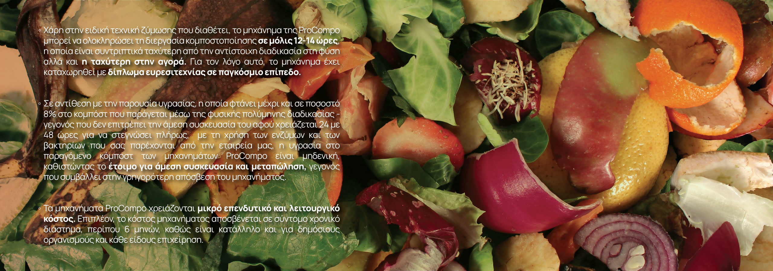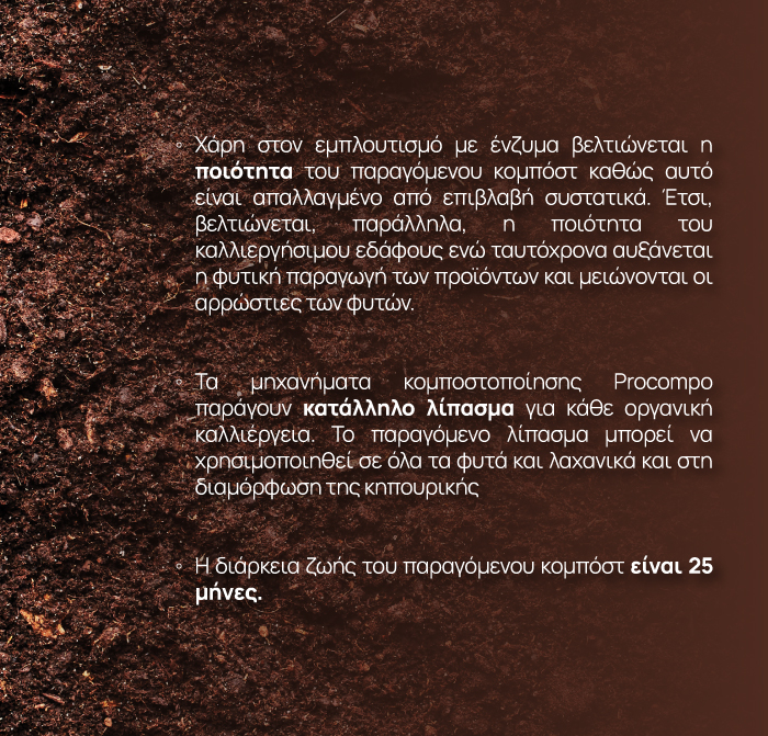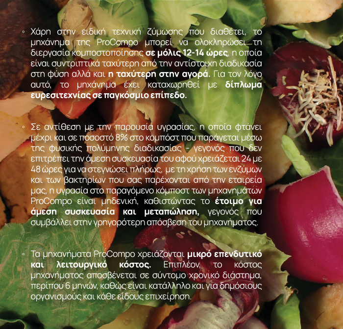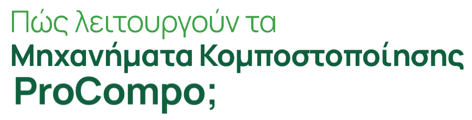 Η μηχανή ProCompo έχει σχεδιαστεί εξ ολοκλήρου εμπνευσμένη από τη φύση. Με άλλα λόγια, όλες οι διαδικασίες λειτουργίας της για την παραγωγή κομπόστ είναι οι ίδιες με αυτές που συμβαίνουν στο φυσικό περιβάλλον: αποσύνθεση και ζύμωση. Η μόνη διαφορά είναι πως η διεργασία αυτή στη φύση μπορεί να διαρκέσει πολλούς μήνες ενώ με τη χρήση των μηχανημάτων ProCompo φτάνουμε στο ίδιο αποτέλεσμα μέσα σε 12-14 ώρες!