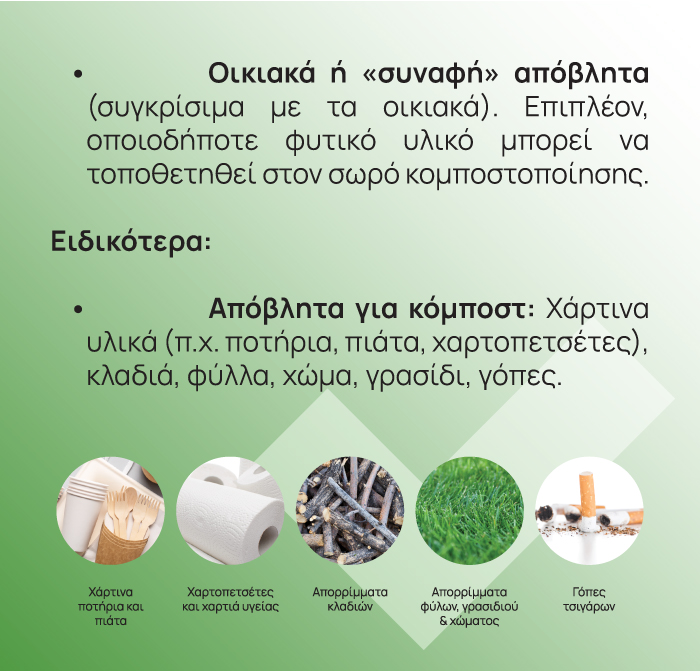 Τα απορρίμματα κήπου/οργανικά είναι περίπου το 20% των συνολικών απορριμμάτων που καταλήγουν στις χωματερές κάθε χρόνο. Η επιλογή της κομποστοποίησης μειώνει την ανάγκη για καύση ή ταφή των οργανικών και βελτιώνει την ποιότητα των επιφανειακών εδαφών μας.