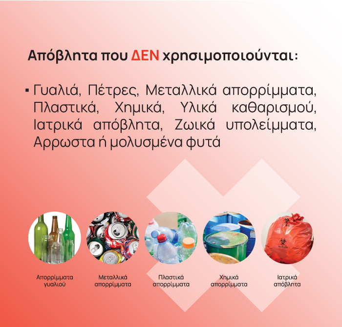 Τα απόβλητα μετατρέπονται σε οργανικό λίπασμα το οποίο αφού στεγνώσει πλήρως είναι έτοιμο για χρήση/αποθήκευση.