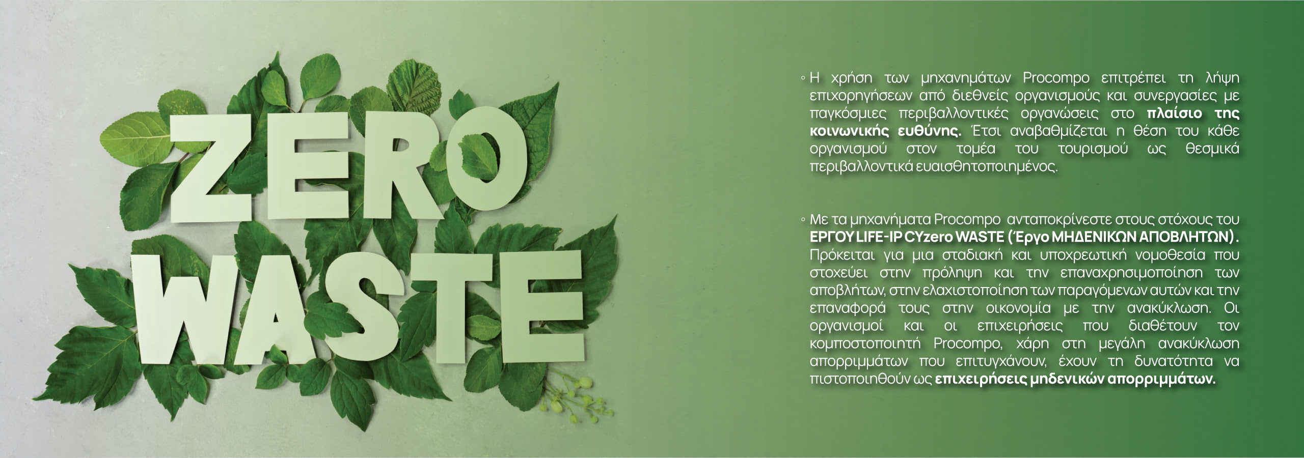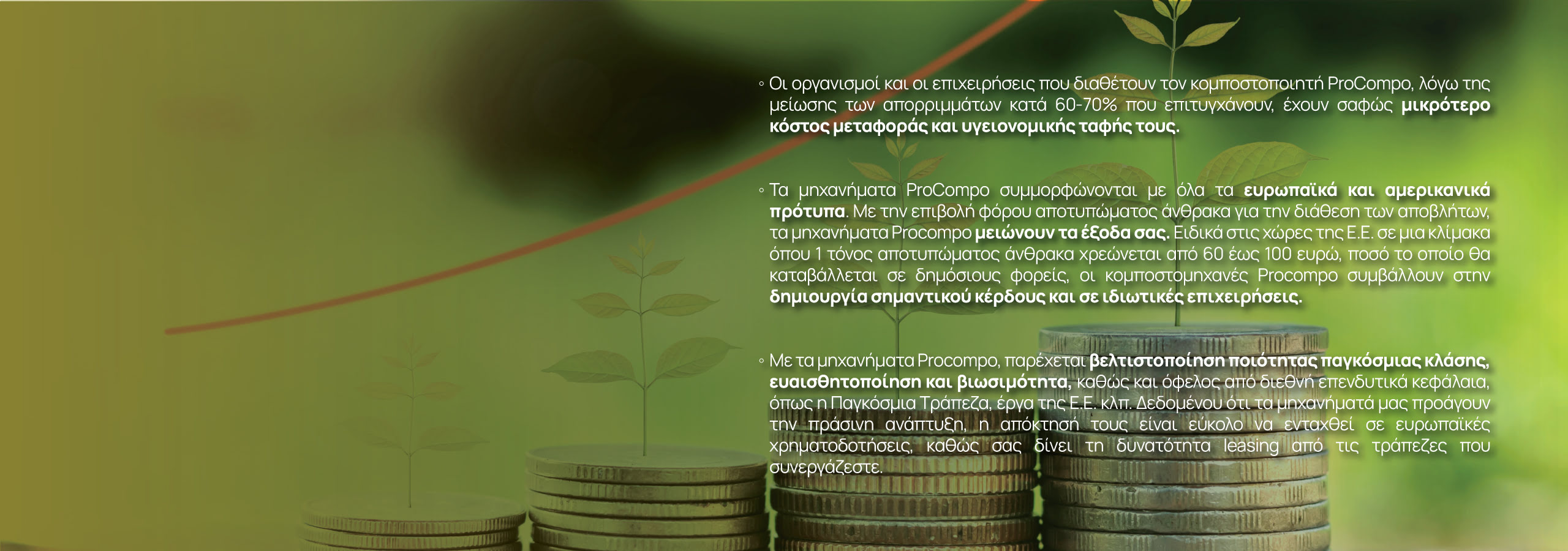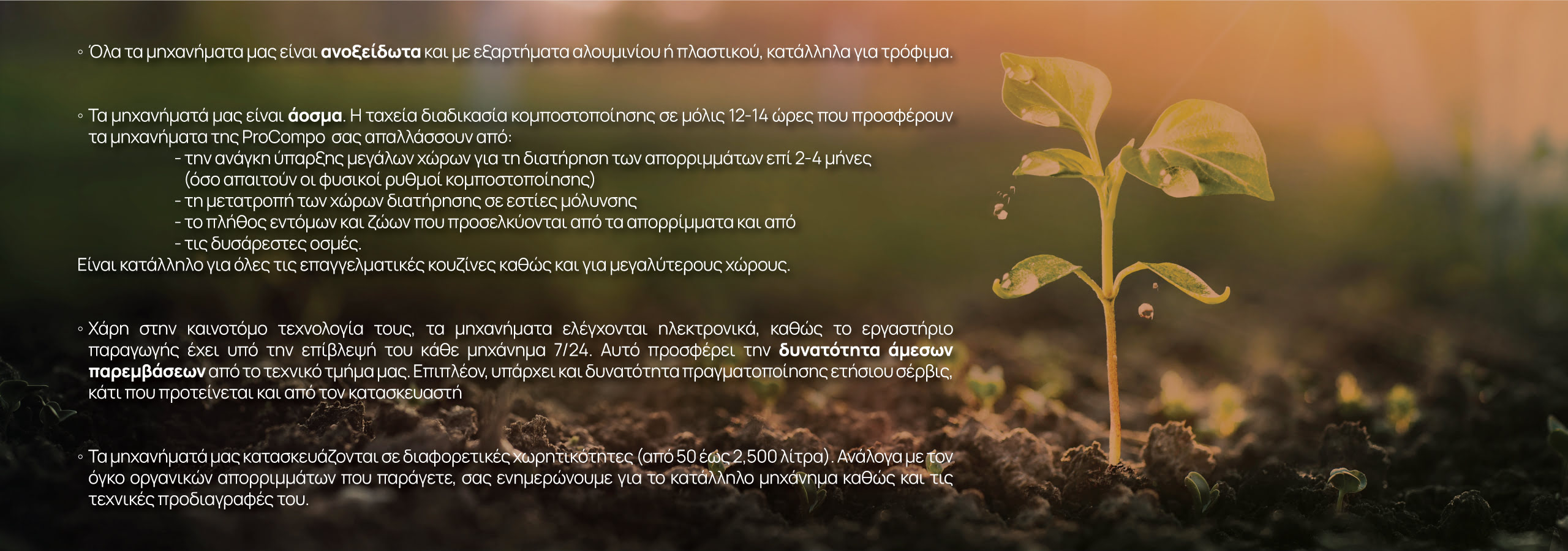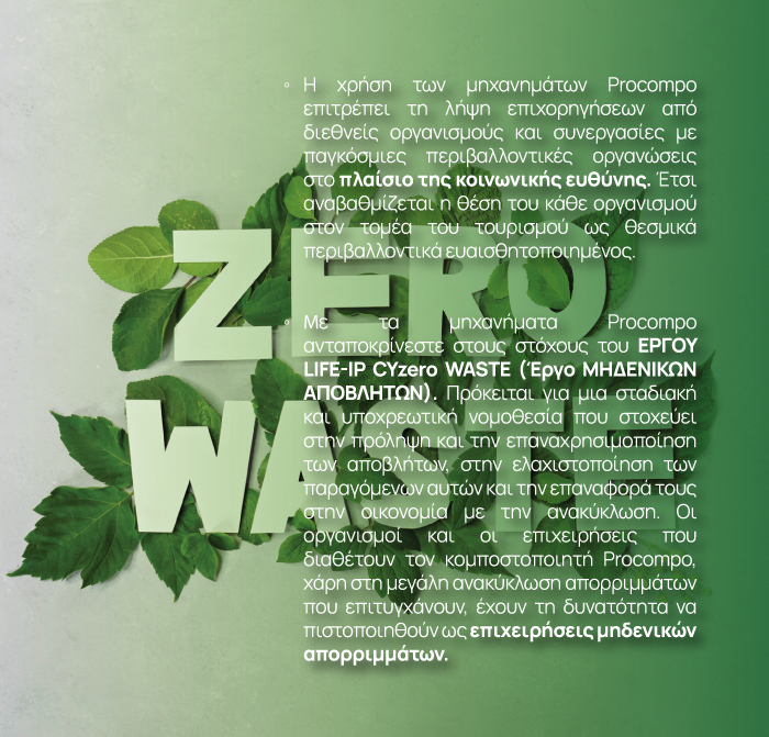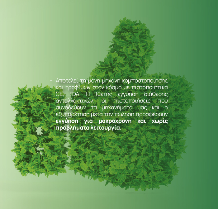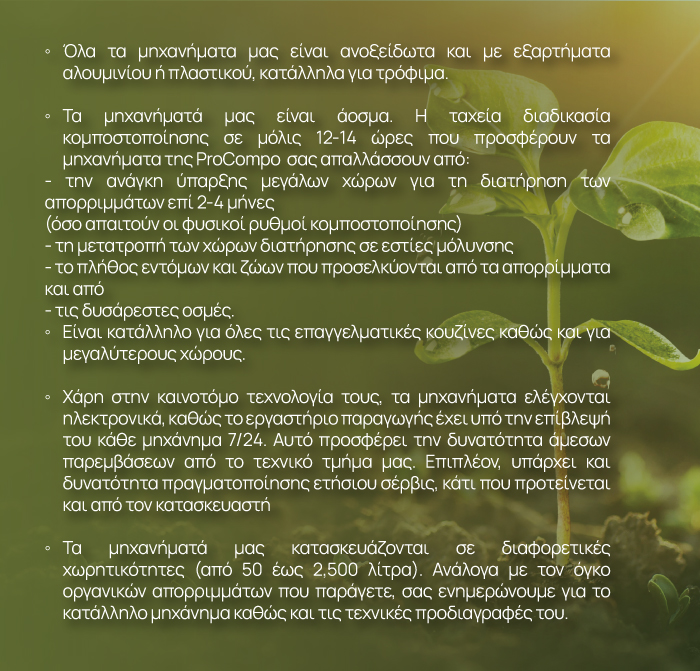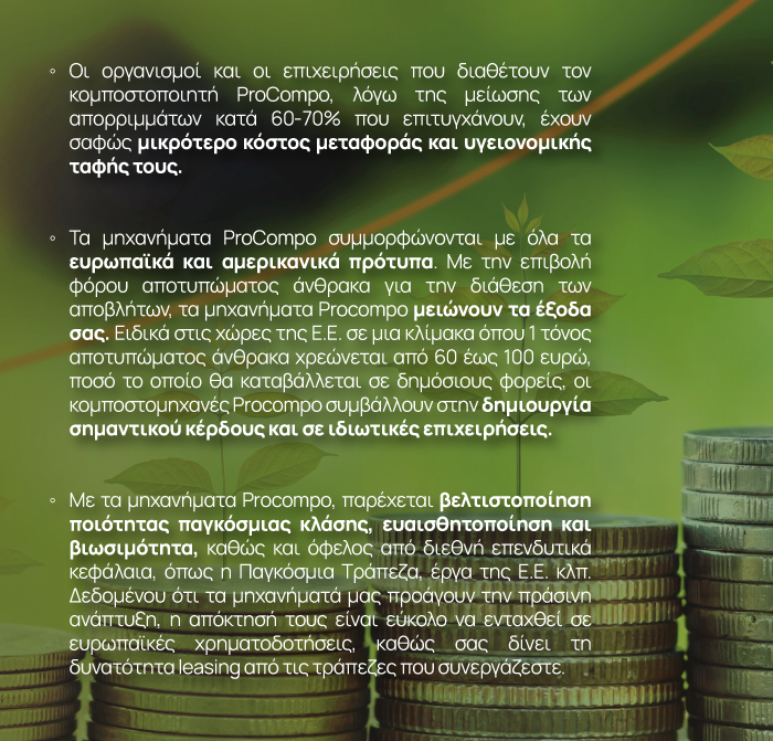 - Με χρήση του παραγόμενου κόμποστ εξοικονομείτε το κόστος αγοράς και χρήσης λιπάσματος για τις εγκαταστάσεις σας.